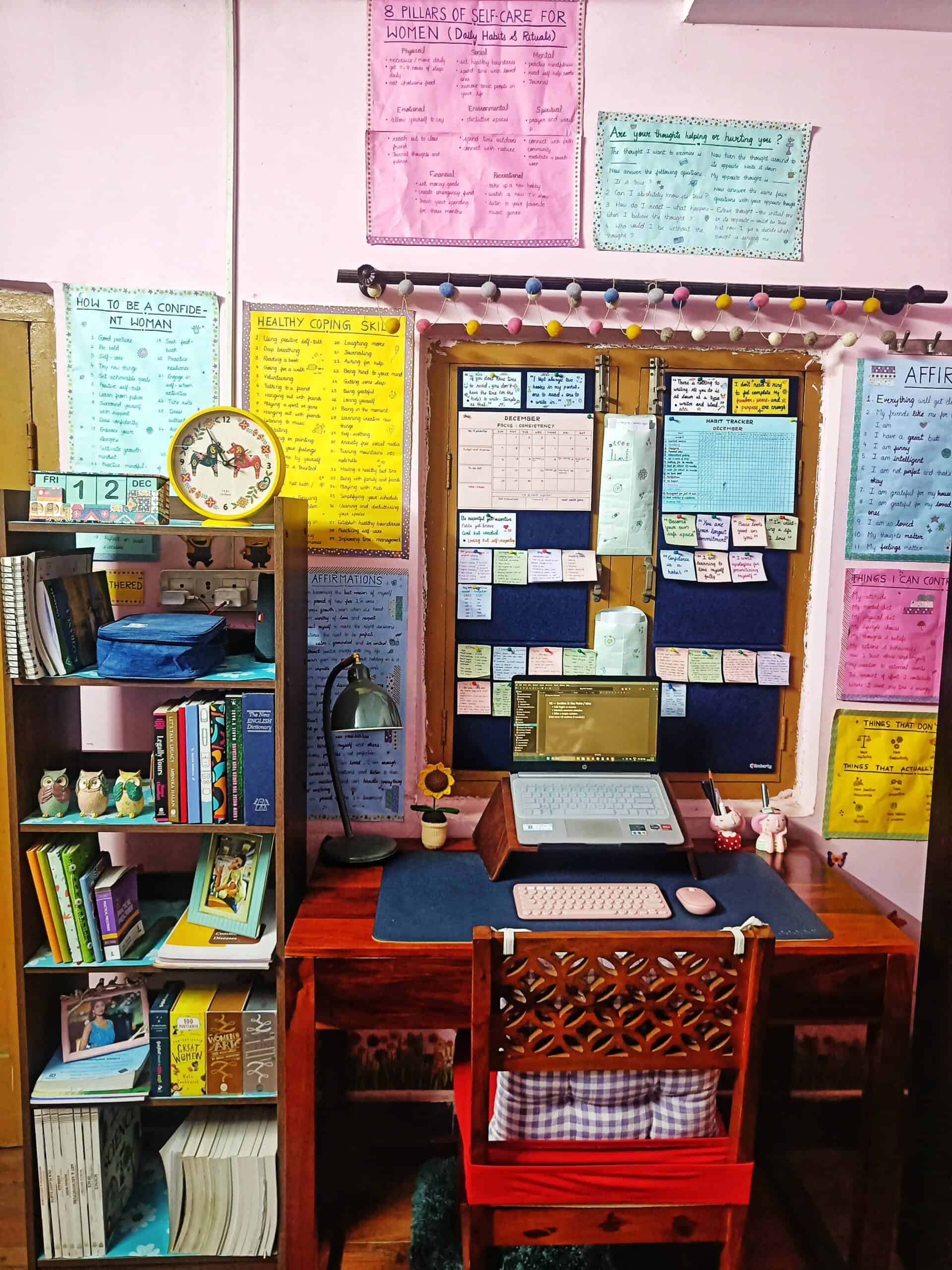 I have shaped this space with care, not for productivity alone, but for steadiness. The charts on the walls, the small handwritten reminders I return to, the books within reach are reminders of how I choose to live, learn, and work.